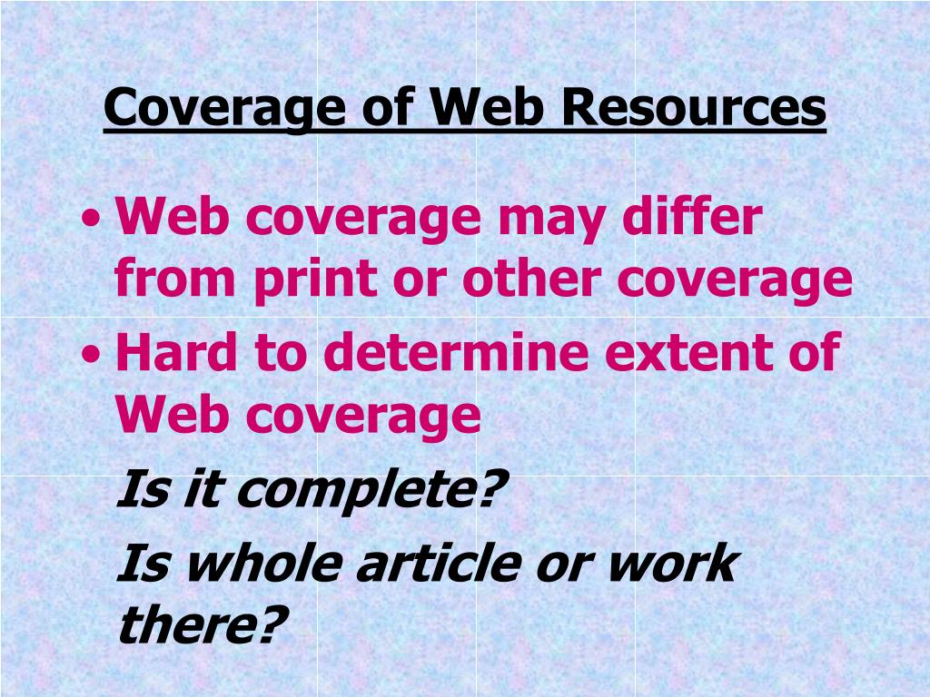 Coverage of Web Resources • Web coverage may differ from print or other coverage • Hard to determine extent of Web coverage Is it complete? Is whole article or work there?