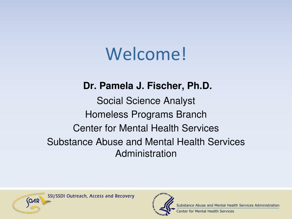 Welcome! Dr. Pamela J. Fischer, Ph.D. Social Science Analyst Homeless Programs Branch Center for Mental Health Services Substance Abuse and Mental Health Services Administration