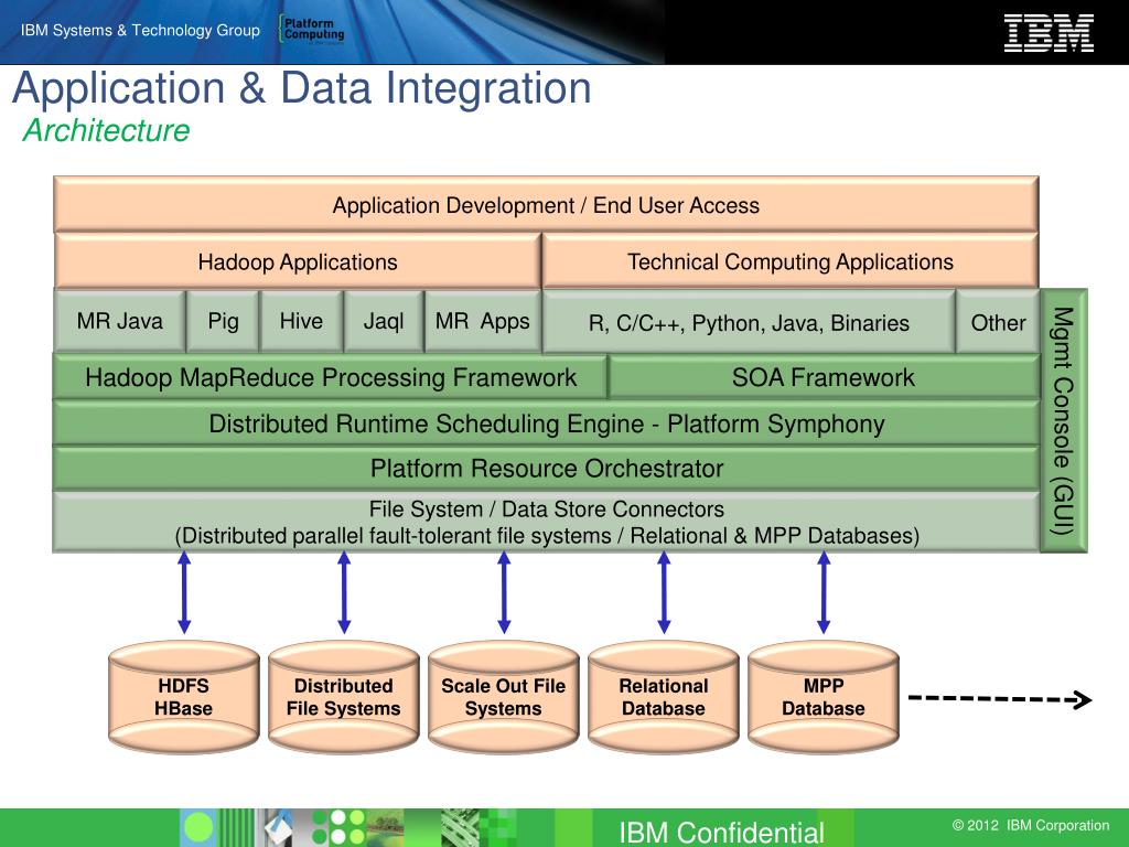 Application & Data IntegrationArchitecture Application Development / End User Access Technical Computing Applications Hadoop Applications MR Java Pig Hive Jaql MR Apps Other R, C/C++, Python, Java, Binaries Hadoop MapReduce Processing Framework SOA Framework Mgmt Console (GUI) Distributed Runtime Scheduling Engine - Platform Symphony Platform Resource Orchestrator Scale Out File Systems Relational Database Distributed File Systems MPP Database HDFS HBase File System / Data Store Connectors (Distributed parallel fault-tolerant file systems / Relational & MPP Databases)