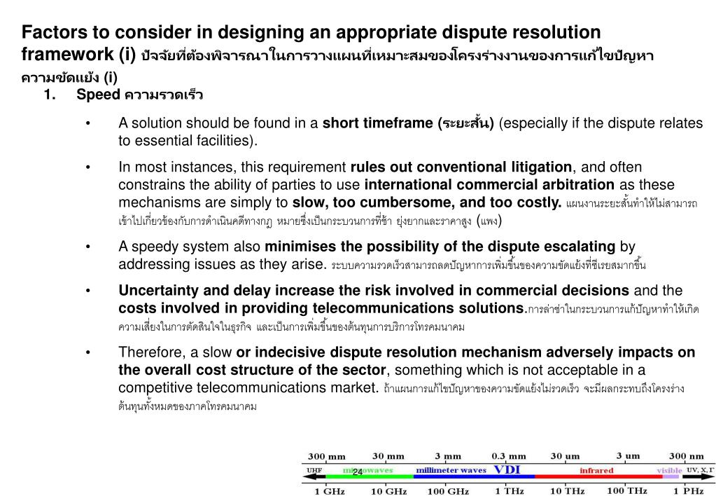 Factors to consider in designing an appropriate dispute resolution framework (i) ปัจจัยที่ต้องพิจารณาในการวางแผนที่เหมาะสมของโครงร่างงานของการแก้ไขปัญหาความขัดแย้ง (i) • Speed ความรวดเร็ว • A solution should be found in a short timeframe (ระยะสั้น) (especially if the dispute relates to essential facilities). • In most instances, this requirement rules out conventional litigation, and often constrains the ability of parties to use international commercial arbitration as these mechanisms are simply to slow, too cumbersome, and too costly. แผนงานระยะสั้นทำให้ไม่สามารถเข้าไปเกี่ยวข้องกับการดำเนินคดีทางกฎ หมายซึ่งเป็นกระบวนการที่ช้า ยุ่งยากและราคาสูง (แพง) • A speedy system also minimises the possibility of the dispute escalating by addressing issues as they arise. ระบบความรวดเร็วสามารถลดปัญหาการเพิ่มขึ้นของความขัดแย้งที่ซีเรยสมากขึ้น • Uncertainty and delay increase the risk involved in commercial decisions and the costs involved in providing telecommunications solutions.การล่าช่าในกระบวนการแก้ปัญหาทำให้เกิดความเสี่ยงในการตัดสินใจในธุรกิจ และเป็นการเพิ่มขึ้นของต้นทุนการบริการโทรคมนาคม • Therefore, a slow or indecisive dispute resolution mechanism adversely impacts on the overall cost structure of the sector, something which is not acceptable in a competitive telecommunications market. ถ้าแผนการแก้ไขปัญหาของความขัดแย้งไม่รวดเร็ว จะมีผลกระทบถึงโครงร่างต้นทุนทั้งหมดของภาคโทรคมนาคม