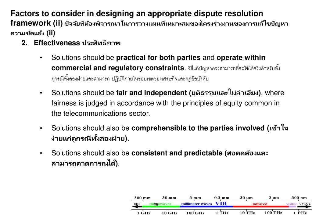 Factors to consider in designing an appropriate dispute resolution framework (ii) ปัจจัยที่ต้องพิจารณาในการวางแผนที่เหมาะสมของโครงร่างงานของการแก้ไขปัญหาความขัดแย้ง (ii) • 2. Effectiveness ประสิทธิภาพ • Solutions should be practical for both parties and operate within commercial and regulatory constraints. วิธีแก้ปัญหาควรสามารถที่จะใช้ได้จริงสำหรับทั้งคู่กรณีทั้งสองฝ่ายและสามารถ ปฎิบัติภายในขอบเขตของเศรษกิจและกฎข้อบังคับ • Solutions should be fair and independent (ยุติธรรมและไม่ลำเอียง), where fairness is judged in accordance with the principles of equity common in the telecommunications sector. • Solutions should also be comprehensible to the parties involved (เข้าใจง่ายแก่คู่กรณีทั้งสองฝ่าย). • Solutions should also be consistent and predictable (สอดคล้องและสามารถคาดการณได้์).