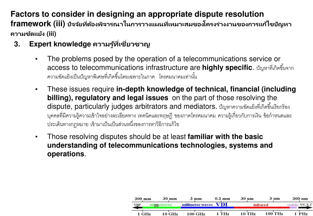 Factors to consider in designing an appropriate dispute resolution framework (iii) ปัจจัยที่ต้องพิจารณาในการวางแผนที่เหมาะสมของโครงร่างงานของการแก้ไขปัญหาความขัดแย้ง (iii) • 3. Expert knowledge ความรู้ที่เชี่ยวชาญ • The problems posed by the operation of a telecommunications service or access to telecommunications infrastructure are highly specific. ปัญหาที่เกิดขึ้นจากความขัดแย้งเป็นปัญหาพิเศษที่เกิดขึ้นโดยเฉพาะในภาค โทรคมนาคมเท่านั้น • These issues require in-depth knowledge of technical, financial (including billing), regulatory and legal issues on the part of those resolving the dispute, particularly judges arbitrators and mediators. ปัญหาความขัดแย้งที่เกิดขึ้นเรียกร้องบุคคลที่มีความรู้ความเข้าใจอย่างละเอียดทาง เทคนิคและทฤษฎี ของภาคโทรคมนาคม ความรู้เกี่ยวกับการเงิน ข้อกำหนดและ ประเด็นทางกฎหมาย เข้ามาเป็นเป็นส่วนหนึ่งของการหาวิธีการแก้ไข • Those resolving disputes should be at least familiar with the basic understanding of telecommunications technologies, systems and operations.