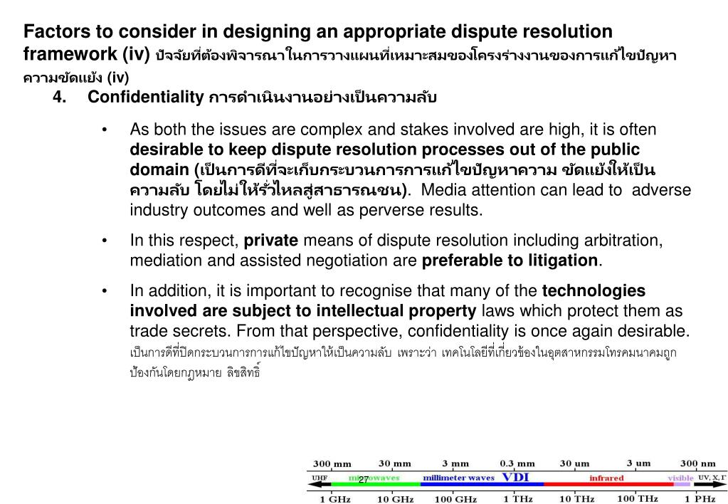 Factors to consider in designing an appropriate dispute resolution framework (iv) ปัจจัยที่ต้องพิจารณาในการวางแผนที่เหมาะสมของโครงร่างงานของการแก้ไขปัญหาความขัดแย้ง (iv) • 4. Confidentiality การดำเนินงานอย่างเป็นความลับ • As both the issues are complex and stakes involved are high, it is often desirable to keep dispute resolution processes out of the public domain (เป็นการดีที่จะเก็บกระบวนการการแก้ไขปัญหาความ ขัดแย้งให้เป็นความลับ โดยไม่ให้รั่วไหลสู่สาธารณชน). Media attention can lead to adverse industry outcomes and well as perverse results. • In this respect, private means of dispute resolution including arbitration, mediation and assisted negotiation are preferable to litigation. • In addition, it is important to recognise that many of the technologies involved are subject to intellectual property laws which protect them as trade secrets. From that perspective, confidentiality is once again desirable. เป็นการดีที่ปิดกระบวนการการแก้ไขปัญหาให้เป็นความลับ เพราะว่า เทคโนโลยีที่เกี่ยวข้องในอุตสาหกรรมโทรคมนาคมถูกป้องกันโดยกฎหมาย ลิขสิทธิ์