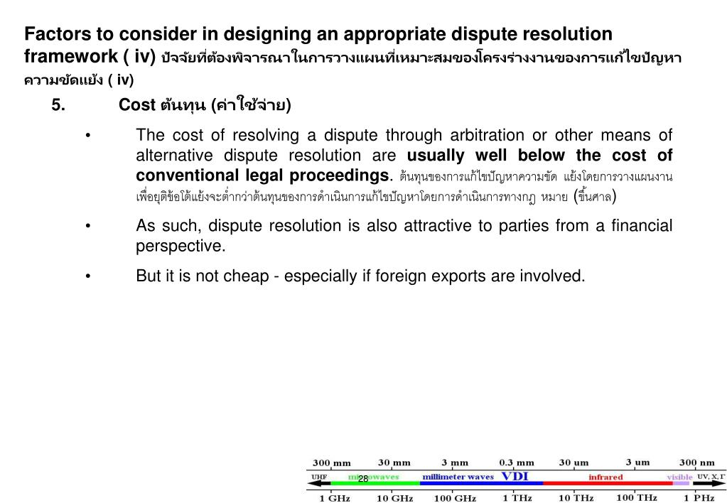 Factors to consider in designing an appropriate dispute resolution framework ( iv) ปัจจัยที่ต้องพิจารณาในการวางแผนที่เหมาะสมของโครงร่างงานของการแก้ไขปัญหาความขัดแย้ง ( iv) 5. Cost ต้นทุน (ค่าใช้จ่าย) • The cost of resolving a dispute through arbitration or other means of alternative dispute resolution are usually well below the cost of conventional legal proceedings. ต้นทุนของการแก้ไขปัญหาความขัด แย้งโดยการวางแผนงานเพื่อยุติข้อโต้แย้งจะต่ำกว่าต้นทุนของการดำเนินการแก้ไขปัญหาโดยการดำเนินการทางกฎ หมาย (ขึ้นศาล) • As such, dispute resolution is also attractive to parties from a financial perspective. • But it is not cheap - especially if foreign exports are involved.