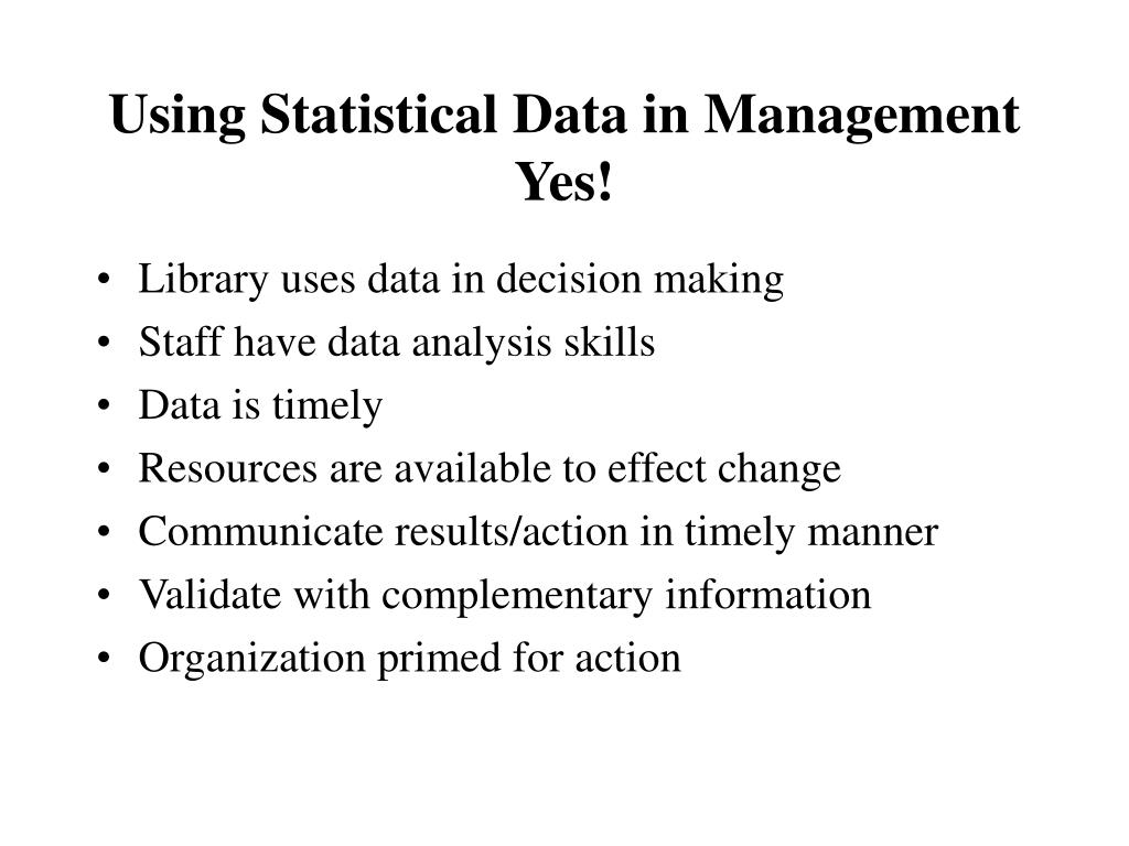 Using Statistical Data in ManagementYes! • Library uses data in decision making • Staff have data analysis skills • Data is timely • Resources are available to effect change • Communicate results/action in timely manner • Validate with complementary information • Organization primed for action