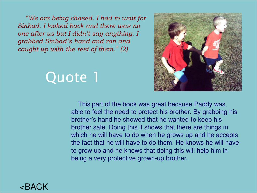 “We are being chased. I had to wait for Sinbad. I looked back and there was no one after us but I didn’t say anything. I grabbed Sinbad’s hand and ran and caught up with the rest of them.” (2) Quote 1 This part of the book was great because Paddy was able to feel the need to protect his brother. By grabbing his brother’s hand he showed that he wanted to keep his brother safe. Doing this it shows that there are things in which he will have to do when he grows up and he accepts the fact that he will have to do them. He knows he will have to grow up and he knows that doing this will help him in being a very protective grown-up brother. <BACK
