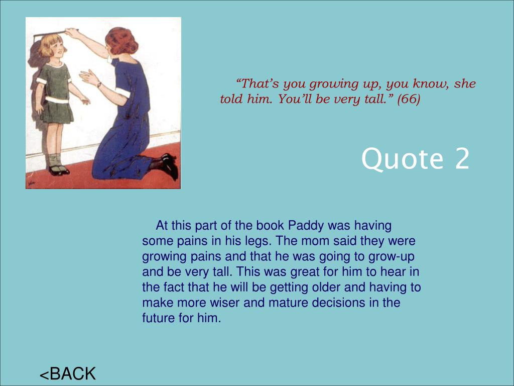 “That’s you growing up, you know, she told him. You’ll be very tall.” (66) Quote 2 At this part of the book Paddy was having some pains in his legs. The mom said they were growing pains and that he was going to grow-up and be very tall. This was great for him to hear in the fact that he will be getting older and having to make more wiser and mature decisions in the future for him. <BACK