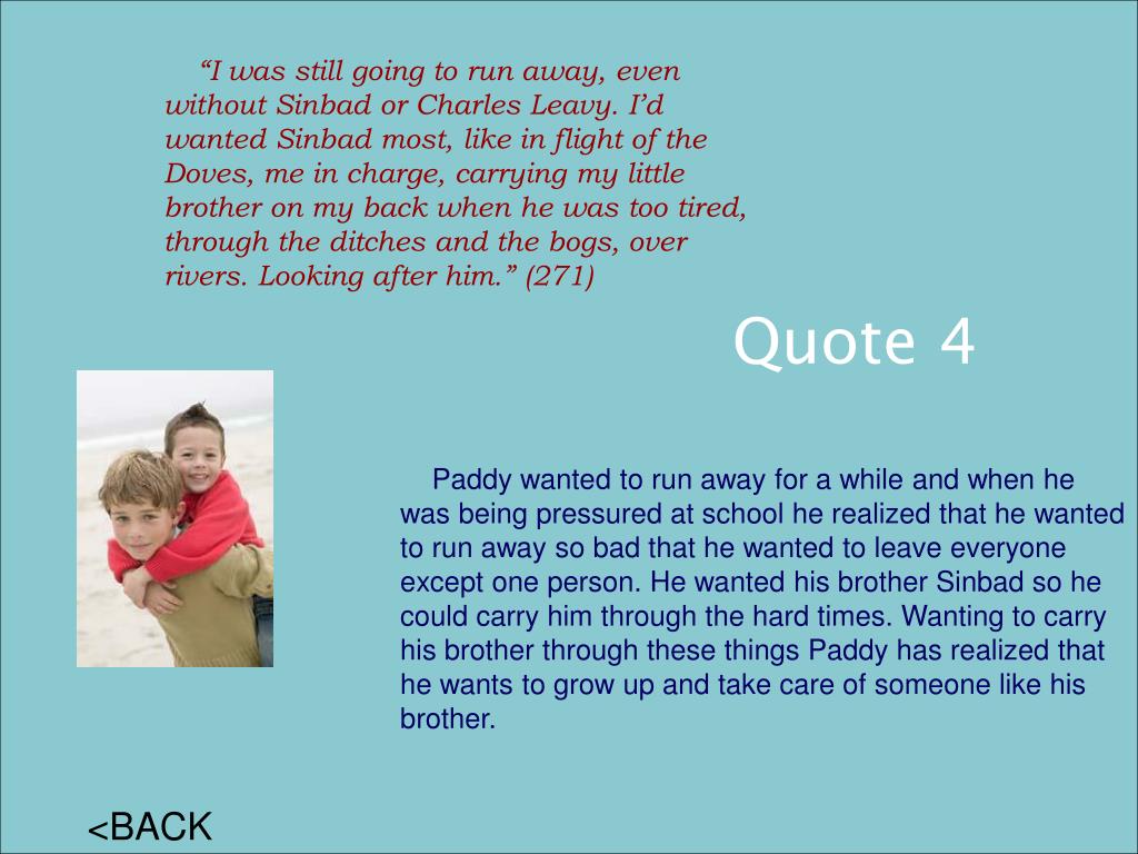 “I was still going to run away, even without Sinbad or Charles Leavy. I’d wanted Sinbad most, like in flight of the Doves, me in charge, carrying my little brother on my back when he was too tired, through the ditches and the bogs, over rivers. Looking after him.” (271) Quote 4 Paddy wanted to run away for a while and when he was being pressured at school he realized that he wanted to run away so bad that he wanted to leave everyone except one person. He wanted his brother Sinbad so he could carry him through the hard times. Wanting to carry his brother through these things Paddy has realized that he wants to grow up and take care of someone like his brother. <BACK