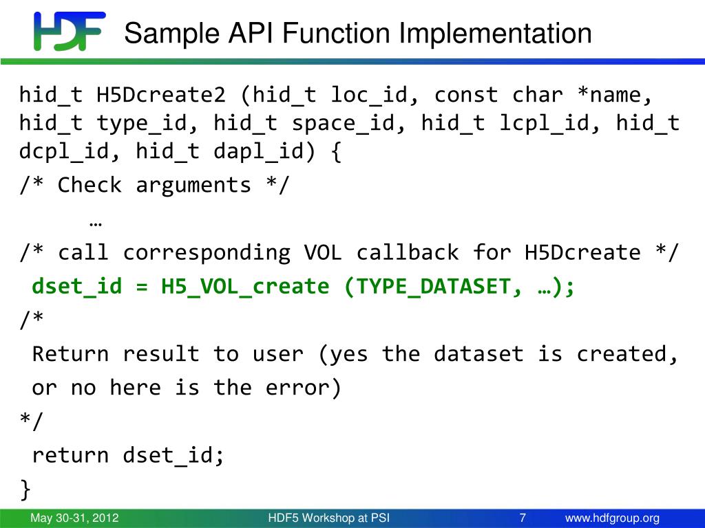 Sample API Function Implementation hid_t H5Dcreate2 (hid_tloc_id, const char *name, hid_ttype_id, hid_tspace_id, hid_tlcpl_id, hid_tdcpl_id, hid_tdapl_id) { /* Check arguments */ … /* call corresponding VOL callback for H5Dcreate */ dset_id= H5_VOL_create (TYPE_DATASET, …); /* Return result to user (yes the dataset is created, or no here is the error) */ return dset_id; } HDF5 Workshop at PSI