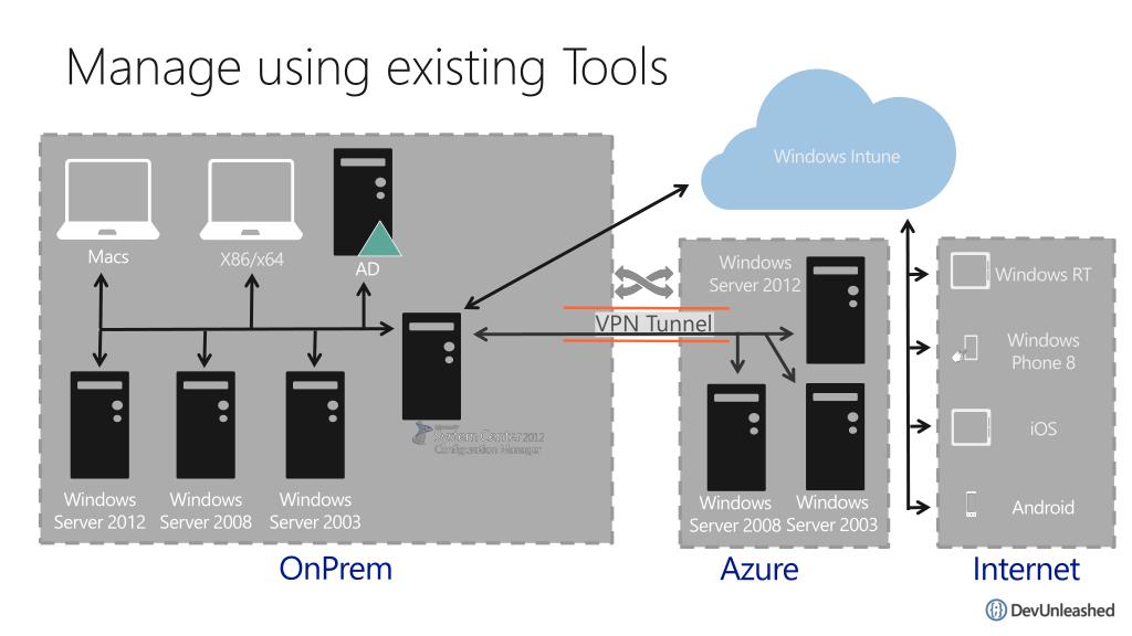 Manage using existing Tools Windows Intune Macs X86/x64 Windows Server 2012 Windows RT Windows Phone 8 VPN Tunnel AD iOS Windows Server 2012 Windows Server 2008 Windows Server 2003 Windows Server 2003 Windows Server 2008 Android OnPrem Azure Internet