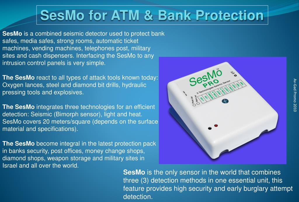 SesMo for ATM & Bank Protection SesMo is a combined seismic detector used to protect bank safes, media safes, strong rooms, automatic ticket machines, vending machines, telephones post, military sites and cash dispensers. Interfacing the SesMo to any intrusion control panels is very simple.The SesMo react to all types of attack tools known today: Oxygen lances, steel and diamond bit drills, hydraulic pressing tools and explosives.The SesMo integrates three technologies for an efficient detection: Seismic (Bimorph sensor), light and heat. SesMo covers 20 meters/square (depends on the surface material and specifications). The SesMo become integral in the latest protection pack in banks security, post offices, money change shops, diamond shops, weapon storage and military sites in Israel and all over the world. Av-Gad Promo 2010 SesMo is the only sensor in the world that combines three (3) detection methods in one essential unit, this feature provides high security and early burglary attempt detection.