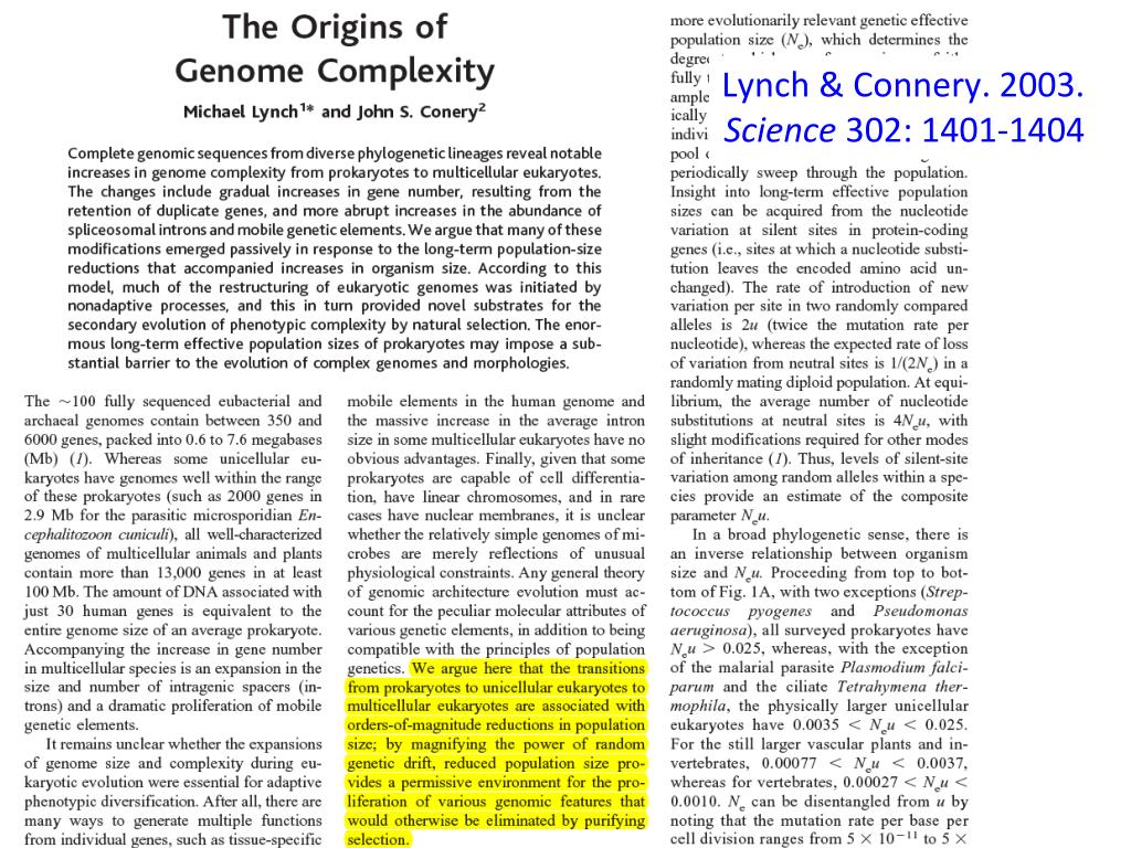 Lynch & Connery’s argument on causes of evolution of genome size and complexity • Transitions from prokaryotes to unicellular eukaryotes to multicellular eukaryotes are associated with orders-of-magnitude reductions in population size • Reduced population size increases the power of Genetic Drift, weakening the effect of natural selection to remove various genomic features that would tend to proliferate (such as transposons, introns, gene families)