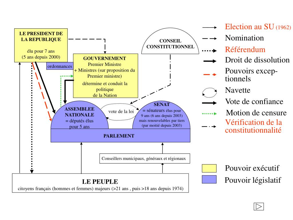 Election au SU (1962) LE PRESIDENT DE LA REPUBLIQUE Nomination Référendum élu pour 7 ans (5 ans depuis 2000) Droit de dissolution GOUVERNEMENT Premier Ministre + Ministres (sur proposition du Premier ministre) ordonnances Pouvoir exécutif Pouvoir législatif LE PEUPLE citoyens français (hommes et femmes) majeurs (>21 ans , puis >18 ans depuis 1974)