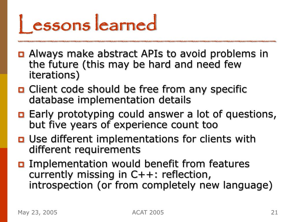 Lessons learned • Always make abstract APIs to avoid problems in the future (this may be hard and need few iterations) • Client code should be free from any specific database implementation details • Early prototyping could answer a lot of questions, but five years of experience count too • Use different implementations for clients with different requirements • Implementation would benefit from features currently missing in C++: reflection, introspection (or from completely new language) ACAT 2005
