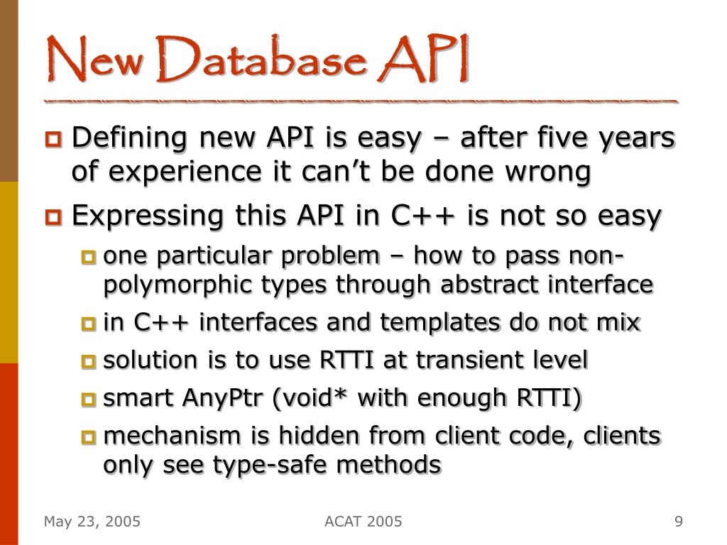 New Database API • Defining new API is easy – after five years of experience it can’t be done wrong • Expressing this API in C++ is not so easy • one particular problem – how to pass non-polymorphic types through abstract interface • in C++ interfaces and templates do not mix • solution is to use RTTI at transient level • smart AnyPtr (void* with enough RTTI) • mechanism is hidden from client code, clients only see type-safe methods ACAT 2005