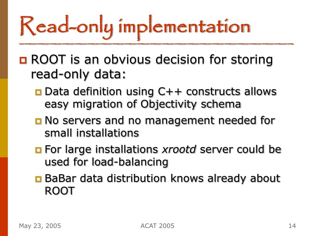 Read-only implementation • ROOT is an obvious decision for storing read-only data: • Data definition using C++ constructs allows easy migration of Objectivity schema • No servers and no management needed for small installations • For large installations xrootd server could be used for load-balancing • BaBar data distribution knows already about ROOT ACAT 2005