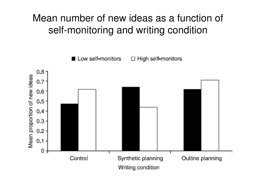 Galbraith, Torrance & Hallam (2006) • 96 low and high self-monitors writing an essay discussing whether the use of violence to achieve political aims can be justified. • 3 writing conditions • Rough draft • Outline planned • Control List ideas & rate relationships before writing Write List ideas & rate relationships after writing