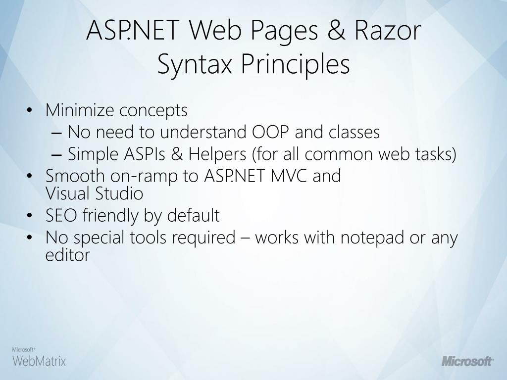 Who is WebMatrix for? • Students, New developers • for quickly building websites with ASP.NET • Professional Developers • for your non daily-job • for a “quick&dirty” solution Task Oriented: “I just need something done!” • Developers who build small/medium sites for others • Acquire an App, customize and deploy
