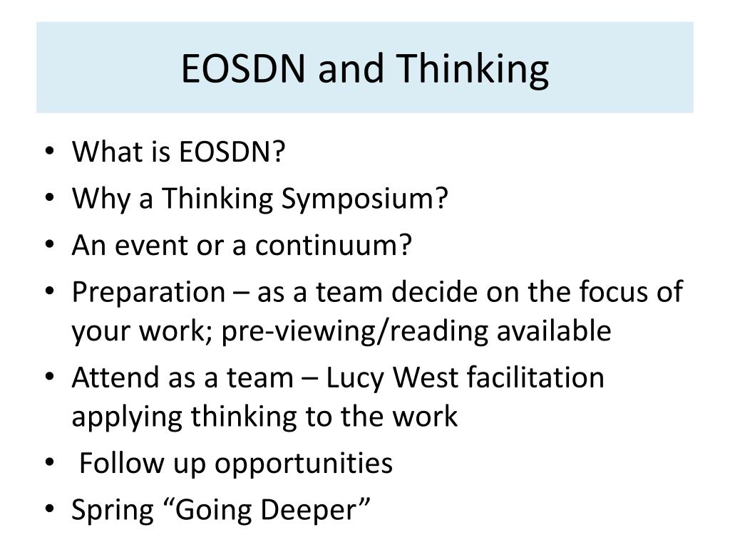 EOSDN and Thinking • What is EOSDN? • Why a Thinking Symposium? • An event or a continuum? • Preparation – as a team decide on the focus of your work; pre-viewing/reading available • Attend as a team – Lucy West facilitation applying thinking to the work • Follow up opportunities • Spring “Going Deeper”