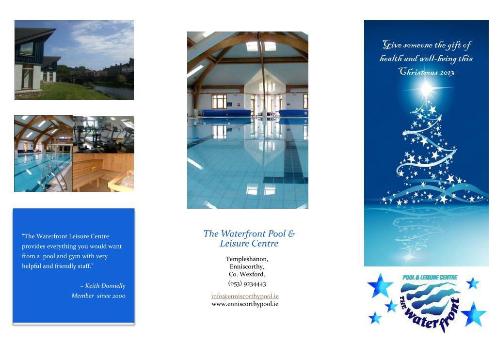 The Waterfront Pool & Leisure Centre Templeshanon, Enniscorthy, Co. Wexford. (053) 9234443 info@enniscorthypool.ie www.enniscorthypool.ie “The Waterfront Leisure Centre provides everything you would want from a pool and gym with very helpful and friendly staff.” ~ Keith Donnelly Member since 2000 Give someone the gift of health and well-being this Christmas 2013 Give the gift of health and well-being to someone this Christmas