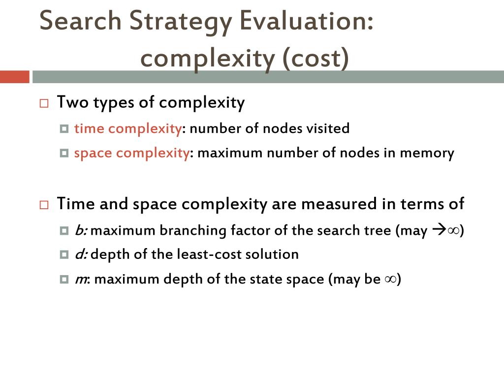 Search Strategy Evaluation: complexity (cost) • Two types of complexity • time complexity: number of nodes visited • space complexity: maximum number of nodes in memory • Time and space complexity are measured in terms of • b: maximum branching factor of the search tree (may ∞) • d: depth of the least-cost solution • m: maximum depth of the state space (may be ∞)