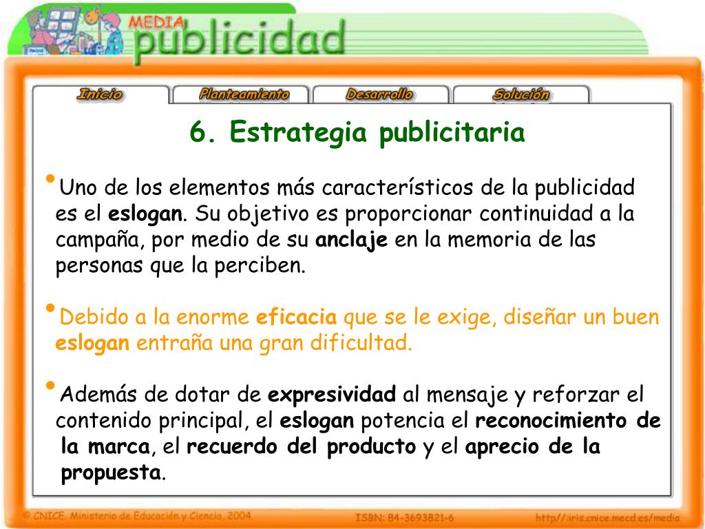 PrácticaMente. 6. Estrategia publicitaria. 6.5 El eslogan. 6. Estrategia publicitaria. Uno de los elementos más característicos de la publicidad es el eslogan . Su objetivo es proporcionar continuidad a la campaña, por medio de su anclaje en la memoria de las
