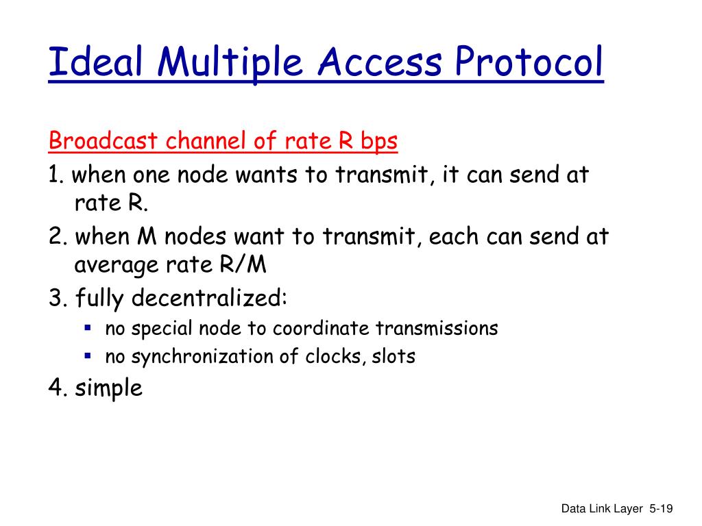 Ideal Multiple Access Protocol Broadcast channel of rate R bps 1. when one node wants to transmit, it can send at rate R. 2. when M nodes want to transmit, each can send at average rate R/M 3. fully decentralized: • no special node to coordinate transmissions • no synchronization of clocks, slots 4. simple Data Link Layer