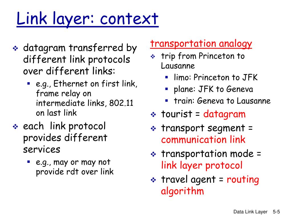 datagram transferred by different link protocols over different links: e.g., Ethernet on first link, frame relay on intermediate links, 802.11 on last link each link protocol provides different services e.g., may or may not provide rdt over link transportation analogy trip from Princeton to Lausanne limo: Princeton to JFK plane: JFK to Geneva train: Geneva to Lausanne tourist = datagram transport segment = communication link transportation mode = link layer protocol travel agent = routing algorithm Link layer: context Data Link Layer