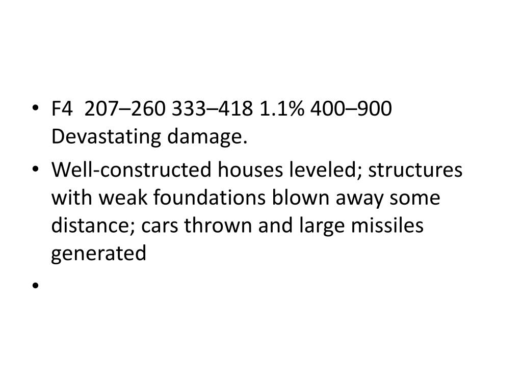 F4 207–260 333–418 1.1% 400–900 Devastating damage. • Well-constructed houses leveled; structures with weak foundations blown away some distance; cars thrown and large missiles generated