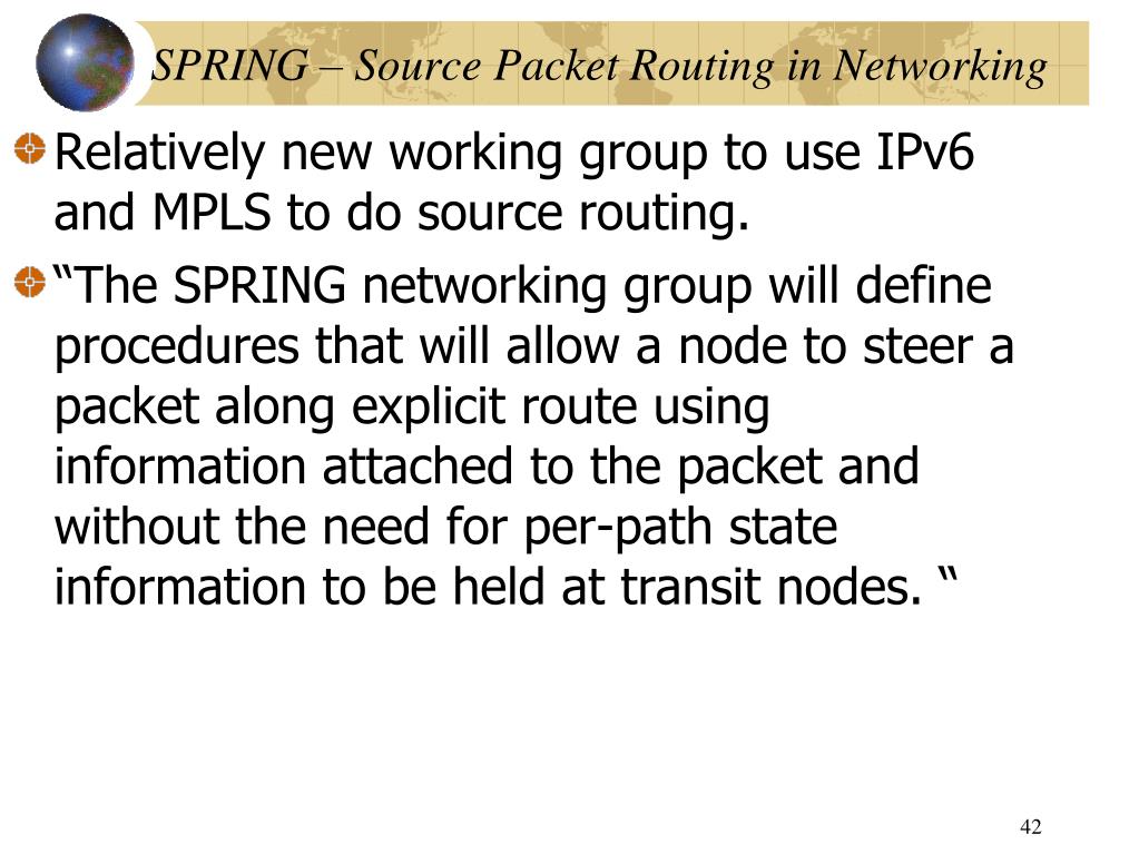 SPRING – Source Packet Routing in Networking • Relatively new working group to use IPv6 and MPLS to do source routing. • “The SPRING networking group will define procedures that will allow a node to steer a packet along explicit route using information attached to the packet and without the need for per-path state information to be held at transit nodes. “