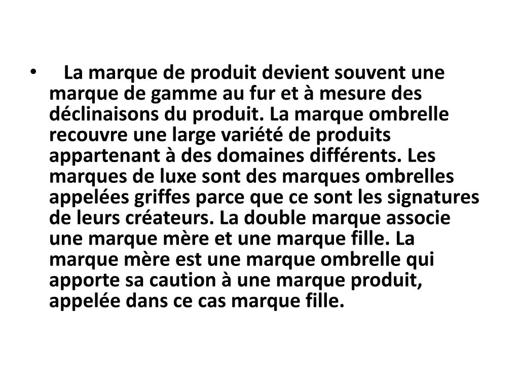 La marque de produit devient souvent une marque de gamme au fur et à mesure des déclinaisons du produit. La marque ombrelle recouvre une large variété de produits appartenant à des domaines différents. Les marques de luxe sont des marques ombrelles appelées griffes parce que ce sont les signatures de leurs créateurs. La double marque associe une marque mère et une marque fille. La marque mère est une marque ombrelle qui apporte sa caution à une marque produit, appelée dans ce cas marque fille.