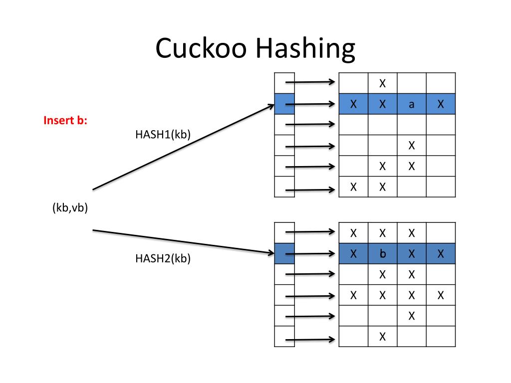 Cuckoo Hashing Insert b: HASH1(kb) (kb,vb) c b HASH2(kb)