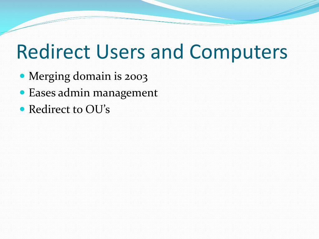 Redirect Users and Computers • Merging domain is 2003 • Eases admin management • Redirect to OU’s