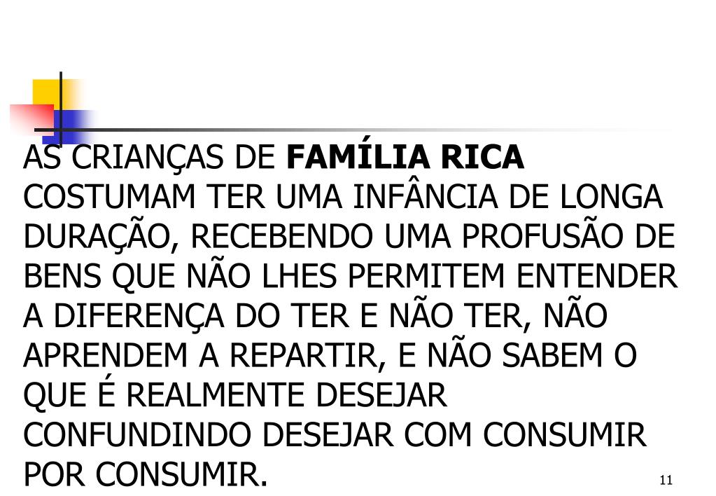 AS CRIANÇAS DE FAMÍLIA RICA COSTUMAM TER UMA INFÂNCIA DE LONGA DURAÇÃO, RECEBENDO UMA PROFUSÃO DE BENS QUE NÃO LHES PERMITEM ENTENDER A DIFERENÇA DO TER E NÃO TER, NÃO APRENDEM A REPARTIR, E NÃO SABEM O QUE É REALMENTE DESEJAR CONFUNDINDO DESEJAR COM CONSUMIR POR CONSUMIR.