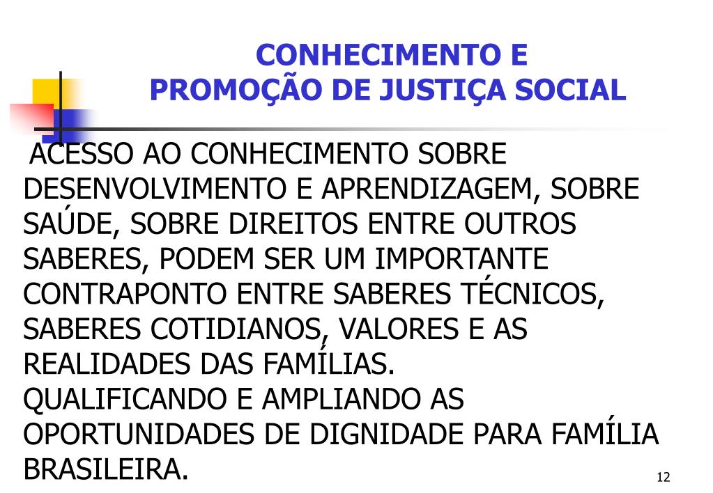 CONHECIMENTO E PROMOÇÃO DE JUSTIÇA SOCIAL ACESSO AO CONHECIMENTO SOBRE DESENVOLVIMENTO E APRENDIZAGEM, SOBRE SAÚDE, SOBRE DIREITOS ENTRE OUTROS SABERES, PODEM SER UM IMPORTANTE CONTRAPONTO ENTRE SABERES TÉCNICOS, SABERES COTIDIANOS, VALORES E AS REALIDADES DAS FAMÍLIAS. QUALIFICANDO E AMPLIANDO AS OPORTUNIDADES DE DIGNIDADE PARA FAMÍLIA BRASILEIRA.
