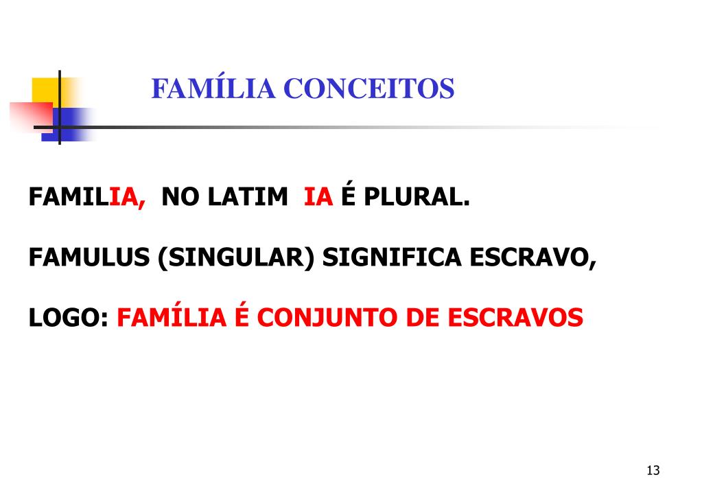 FAMÍLIA CONCEITOS FAMILIA, NO LATIM IA É PLURAL. FAMULUS (SINGULAR) SIGNIFICA ESCRAVO, LOGO: FAMÍLIA É CONJUNTO DE ESCRAVOS