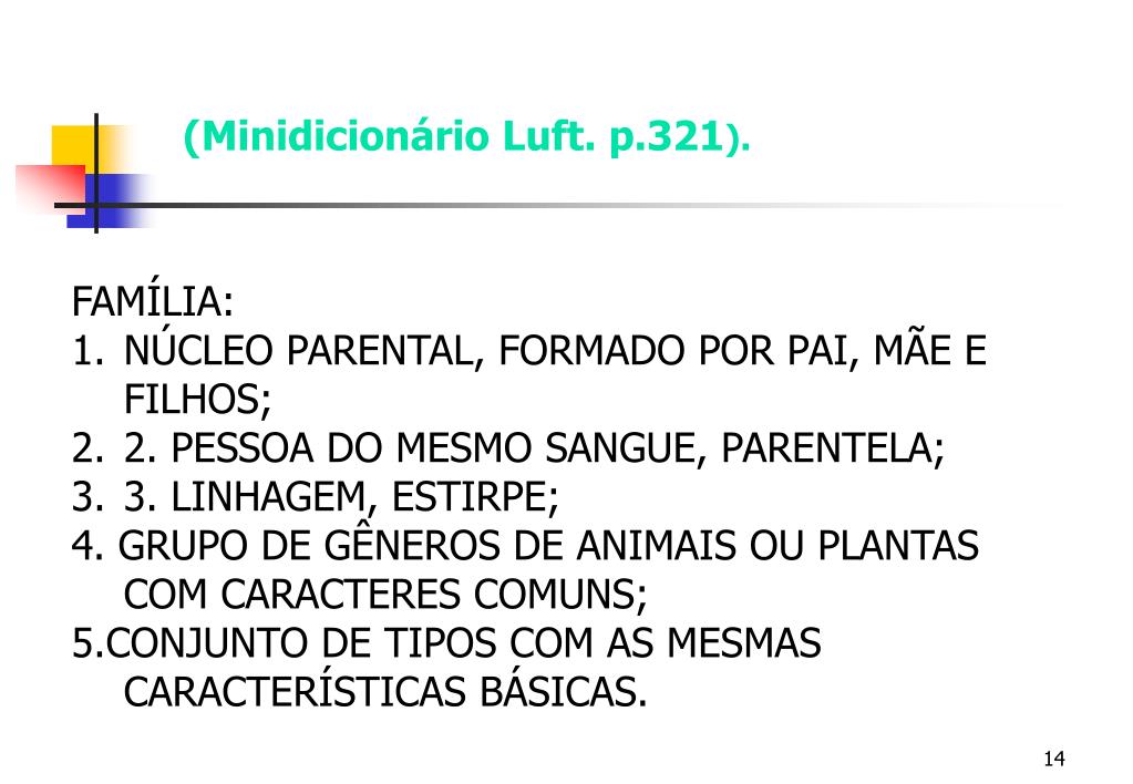 (Minidicionário Luft. p.321). • FAMÍLIA: • NÚCLEO PARENTAL, FORMADO POR PAI, MÃE E FILHOS; • 2. PESSOA DO MESMO SANGUE, PARENTELA; • 3. LINHAGEM, ESTIRPE; • 4. GRUPO DE GÊNEROS DE ANIMAIS OU PLANTAS COM CARACTERES COMUNS; • 5.CONJUNTO DE TIPOS COM AS MESMAS CARACTERÍSTICAS BÁSICAS.