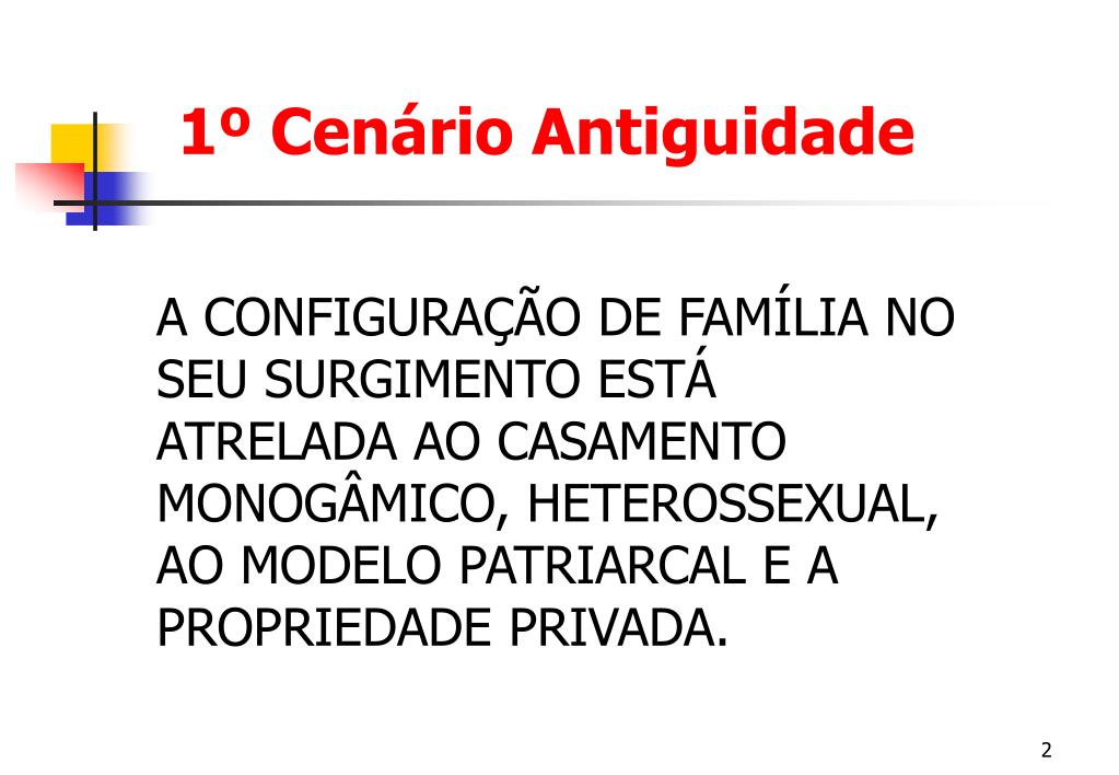 1º Cenário Antiguidade A CONFIGURAÇÃO DE FAMÍLIA NO SEU SURGIMENTO ESTÁ ATRELADA AO CASAMENTO MONOGÂMICO, HETEROSSEXUAL, AO MODELO PATRIARCAL E A PROPRIEDADE PRIVADA.