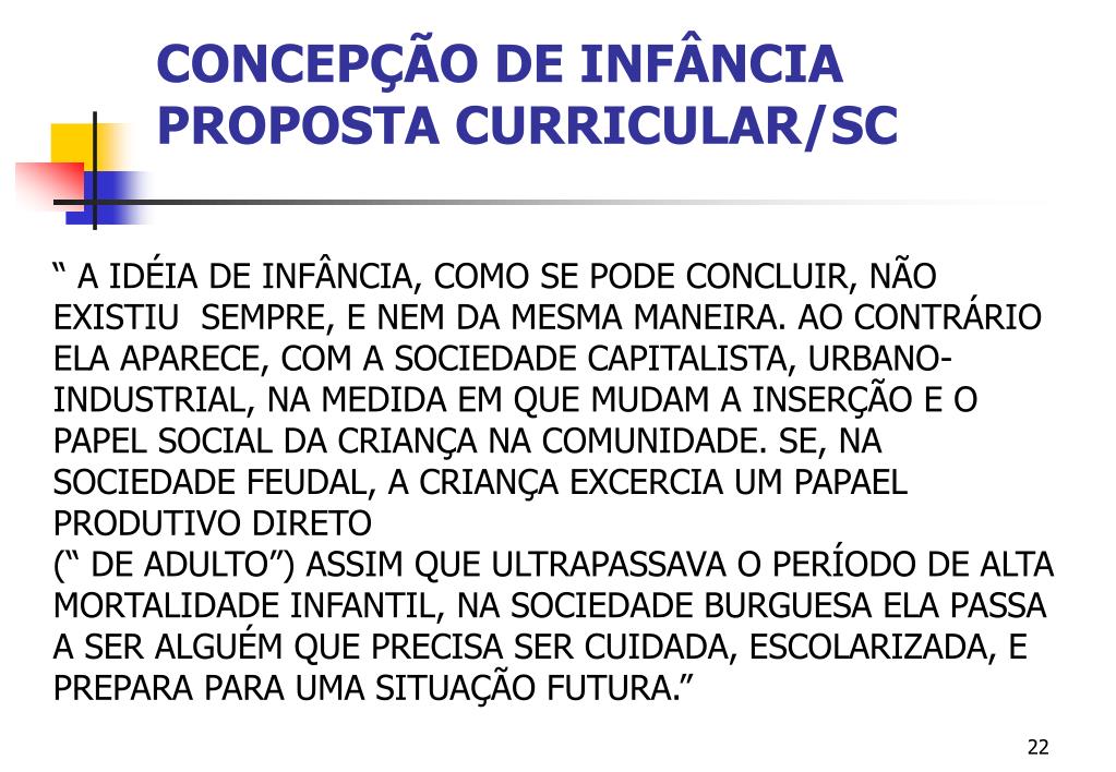 CONCEPÇÃO DE INFÂNCIA PROPOSTA CURRICULAR/SC “ A IDÉIA DE INFÂNCIA, COMO SE PODE CONCLUIR, NÃO EXISTIU SEMPRE, E NEM DA MESMA MANEIRA. AO CONTRÁRIO ELA APARECE, COM A SOCIEDADE CAPITALISTA, URBANO-INDUSTRIAL, NA MEDIDA EM QUE MUDAM A INSERÇÃO E O PAPEL SOCIAL DA CRIANÇA NA COMUNIDADE. SE, NA SOCIEDADE FEUDAL, A CRIANÇA EXCERCIA UM PAPAEL PRODUTIVO DIRETO (“ DE ADULTO”) ASSIM QUE ULTRAPASSAVA O PERÍODO DE ALTA MORTALIDADE INFANTIL, NA SOCIEDADE BURGUESA ELA PASSA A SER ALGUÉM QUE PRECISA SER CUIDADA, ESCOLARIZADA, E PREPARA PARA UMA SITUAÇÃO FUTURA.”