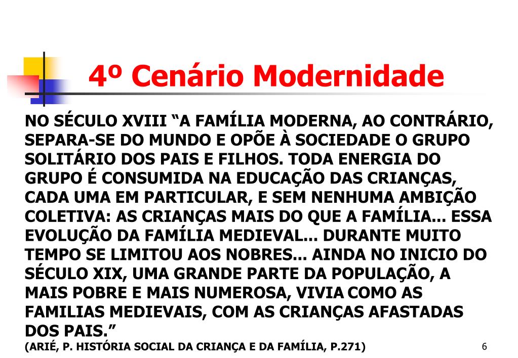 4º Cenário Modernidade NO SÉCULO XVIII “A FAMÍLIA MODERNA, AO CONTRÁRIO, SEPARA-SE DO MUNDO E OPÕE À SOCIEDADE O GRUPO SOLITÁRIO DOS PAIS E FILHOS. TODA ENERGIA DO GRUPO É CONSUMIDA NA EDUCAÇÃO DAS CRIANÇAS, CADA UMA EM PARTICULAR, E SEM NENHUMA AMBIÇÃO COLETIVA: AS CRIANÇAS MAIS DO QUE A FAMÍLIA... ESSA EVOLUÇÃO DA FAMÍLIA MEDIEVAL... DURANTE MUITO TEMPO SE LIMITOU AOS NOBRES... AINDA NO INICIO DO SÉCULO XIX, UMA GRANDE PARTE DA POPULAÇÃO, A MAIS POBRE E MAIS NUMEROSA, VIVIACOMO AS FAMILIAS MEDIEVAIS, COM AS CRIANÇAS AFASTADAS DOS PAIS.” (ARIÉ, P. HISTÓRIA SOCIAL DA CRIANÇA E DA FAMÍLIA, P.271)