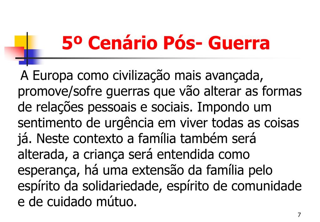 5º Cenário Pós- Guerra A Europa como civilização mais avançada, promove/sofre guerras que vão alterar as formas de relações pessoais e sociais. Impondo um sentimento de urgência em viver todas as coisas já. Neste contexto a família também será alterada, a criança será entendida como esperança, há uma extensão da família pelo espírito da solidariedade, espírito de comunidade e de cuidado mútuo.