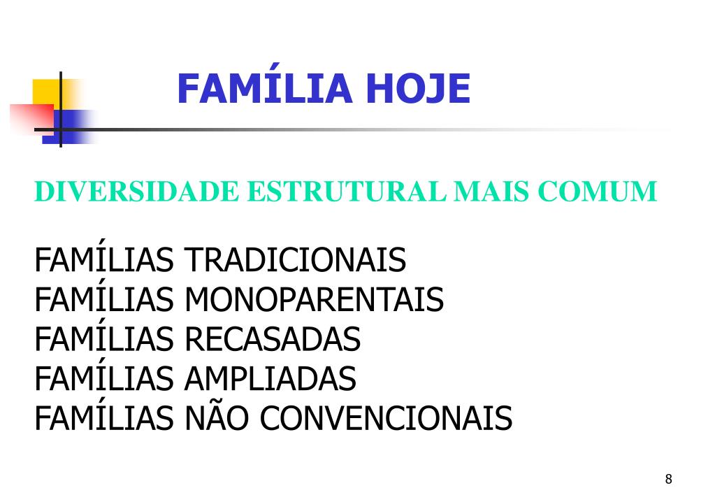FAMÍLIA HOJE DIVERSIDADE ESTRUTURAL MAIS COMUM FAMÍLIAS TRADICIONAIS FAMÍLIAS MONOPARENTAIS FAMÍLIAS RECASADAS FAMÍLIAS AMPLIADAS FAMÍLIAS NÃO CONVENCIONAIS