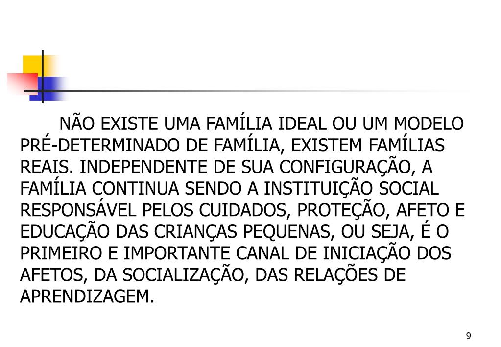 NÃO EXISTE UMA FAMÍLIA IDEAL OU UM MODELO PRÉ-DETERMINADO DE FAMÍLIA, EXISTEM FAMÍLIAS REAIS. INDEPENDENTE DE SUA CONFIGURAÇÃO, A FAMÍLIA CONTINUA SENDO A INSTITUIÇÃO SOCIAL RESPONSÁVEL PELOS CUIDADOS, PROTEÇÃO, AFETO E EDUCAÇÃO DAS CRIANÇAS PEQUENAS, OU SEJA, É O PRIMEIRO E IMPORTANTE CANAL DE INICIAÇÃO DOS AFETOS, DA SOCIALIZAÇÃO, DAS RELAÇÕES DE APRENDIZAGEM.