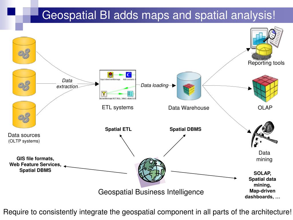 Spatial ETL Spatial DBMS GIS file formats, Web Feature Services, Spatial DBMS SOLAP, Spatial data mining, Map-driven dashboards, … Geospatial Business Intelligence Geospatial BI adds maps and spatial analysis! Require to consistently integrate the geospatial component in all parts of the architecture!