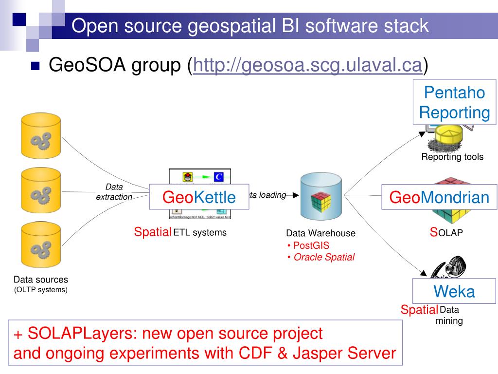 Open source geospatial BI software stack • GeoSOA group (http://geosoa.scg.ulaval.ca) Pentaho Reporting GeoKettle GeoMondrian Spatial S • PostGIS • Oracle Spatial Weka Spatial + SOLAPLayers: new open source project and ongoing experiments with CDF & Jasper Server