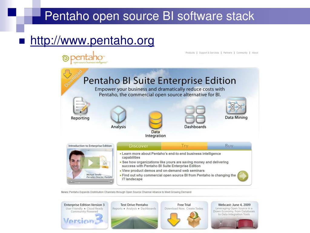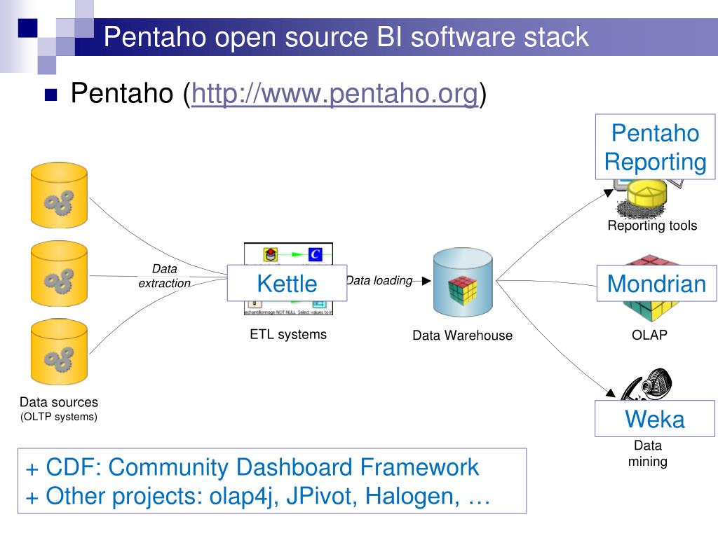 Pentaho open source BI software stack • Pentaho (http://www.pentaho.org) Pentaho Reporting Kettle Mondrian Weka + CDF: Community Dashboard Framework + Other projects: olap4j, JPivot, Halogen, …