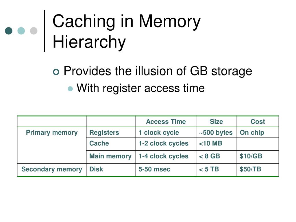 Caching in Memory Hierarchy • Provides the illusion of GB storage • With register access time