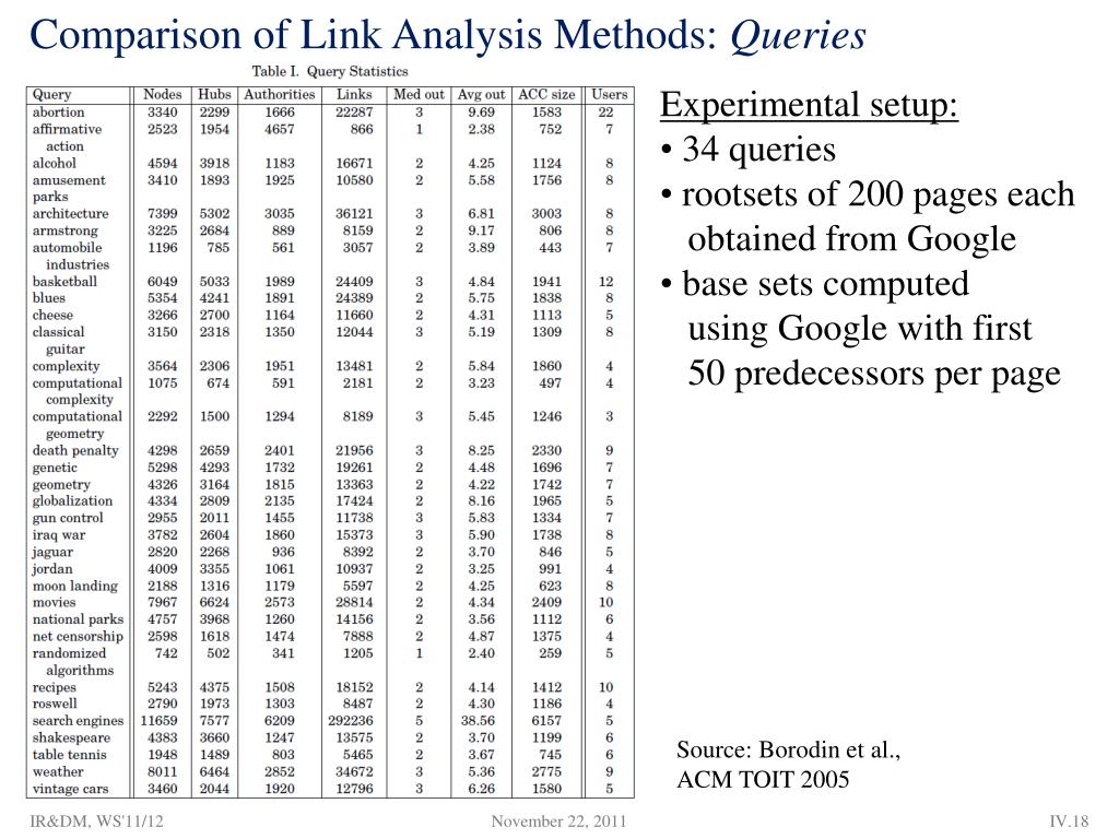 Comparison of Link Analysis Methods: Queries • Experimental setup: • 34 queries • rootsets of 200 pages each • obtained from Google • base sets computed • using Google with first • 50 predecessors per page Source: Borodin et al., ACM TOIT 2005 IR&DM, WS'11/12