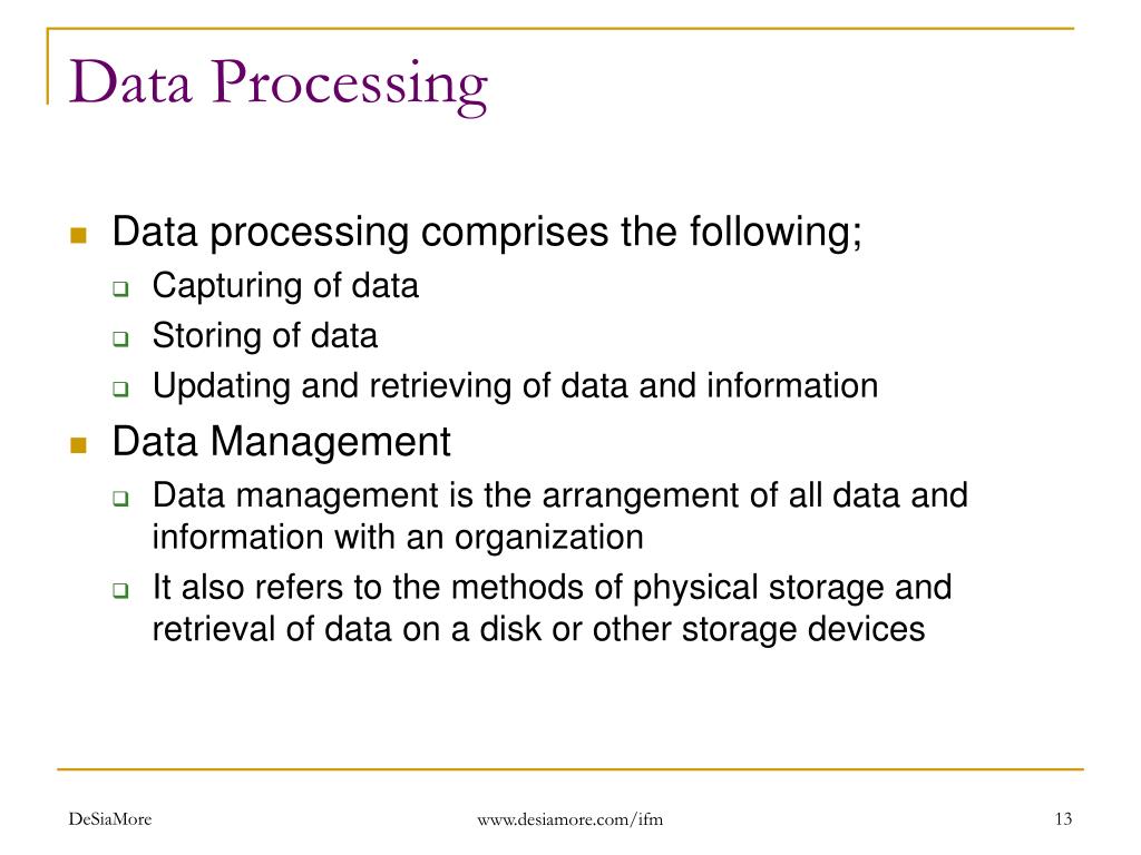 Data Processing • Data processing comprises the following; • Capturing of data • Storing of data • Updating and retrieving of data and information • Data Management • Data management is the arrangement of all data and information with an organization • It also refers to the methods of physical storage and retrieval of data on a disk or other storage devices www.desiamore.com/ifm