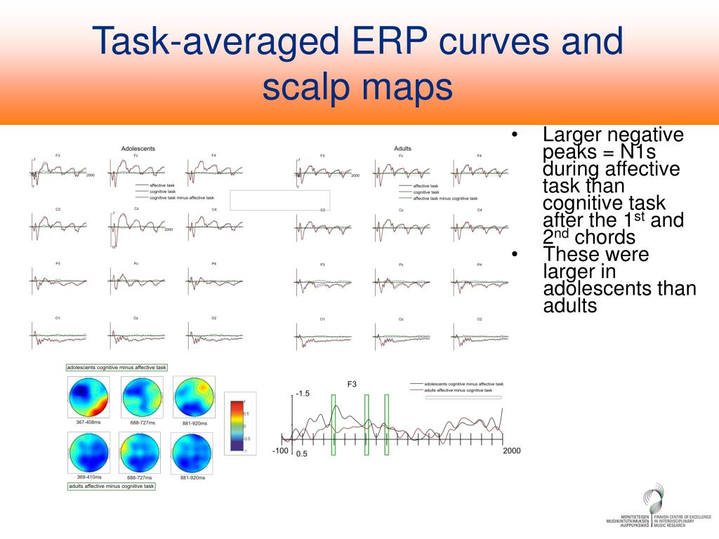 Task-averaged ERP curves and scalp maps • Larger negative peaks = N1s during affective task than cognitive task after the 1st and 2nd chords • These were larger in adolescents than adults